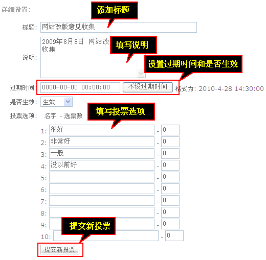 点击“增加投票项目”,弹出详细设置,需要填写标题说明设置过期时间是否生效,还有填写投票选项名字选票数,最后点击“提交新投票”。