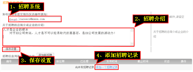 3、输入“邮箱”、“招聘介绍”,点击“保存设置”,点击“添加招聘记录