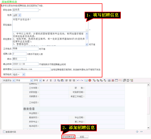 4、填写“招聘信息”后点击“添加招聘信息