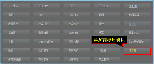 3、输入“标题”,选择“边框”,设置“相关”属性后点击“添加模块”,通过设置参数调整漂浮内容的位置,漂浮内容可以自由编辑。